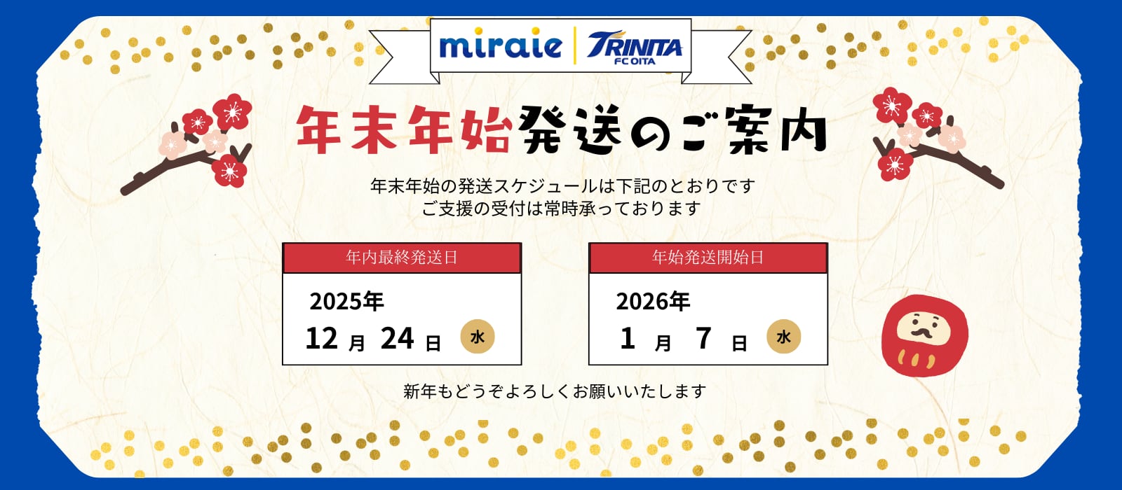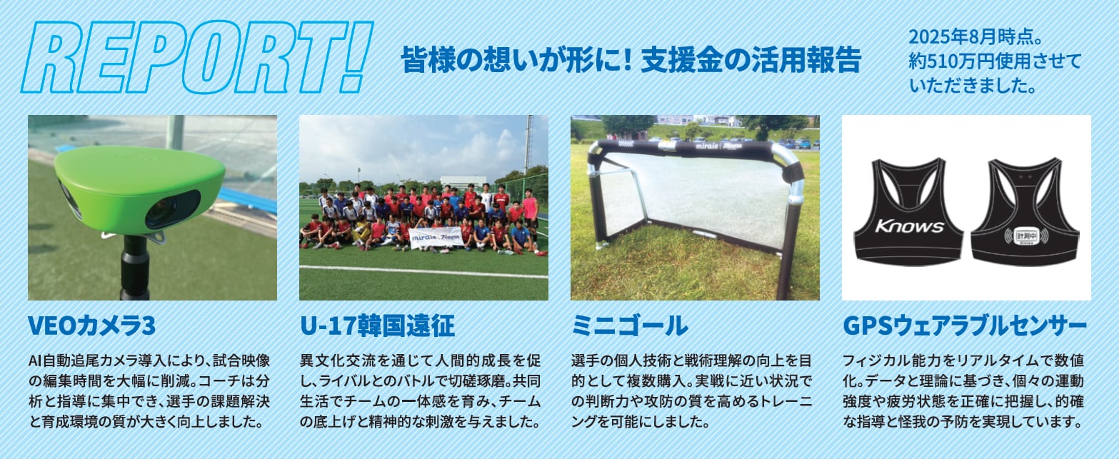 miraieへの支援金は、アカデミー選手の活動費や遠征費、用具の購入費など、大分トリニータアカデミーへの支援金として使用させていただきます。