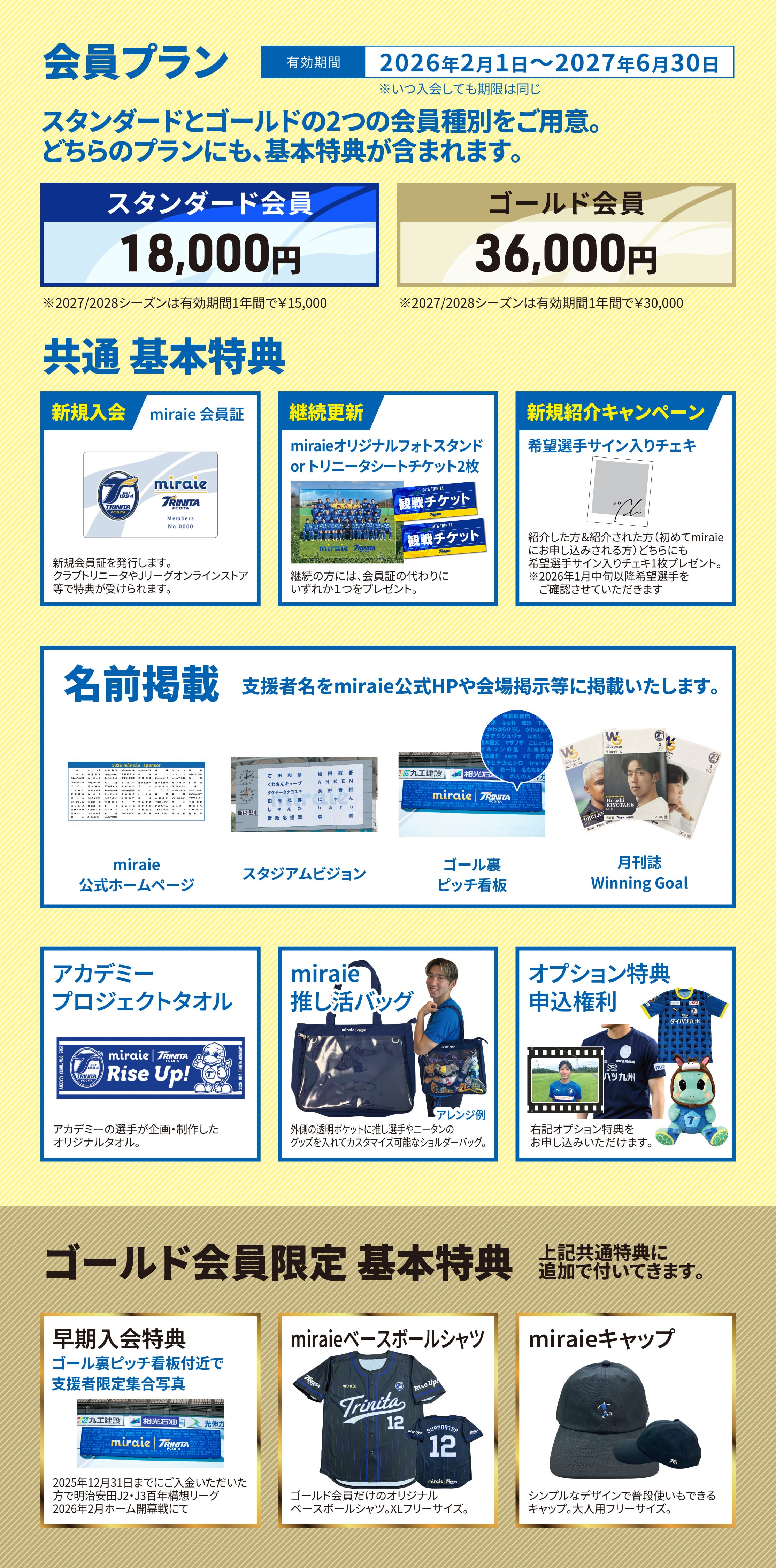 【会員有効期限】 ・2027年6月末日まで(いつご入会いただいても期限は同じです) 【特典内容】 ・新規会員カード(継続の方には継続特典をご用意しています) ・支援者名掲載(月刊誌Winning goal、WEBマガジンRise up!、ゴール裏ピッチ看板、miraie公式HP、スタジアムビジョン) ・アカデミープロジェクトタオル(素材:綿100% サイズ:約1100×400mm) ・miraie推し活バッグ(素材:ポリエステル+PVC サイズ:約460×310×100mm) ・新規紹介キャンペーン(1月中旬以降希望選手を確認させていただき、ご用意が出来次第お届け) ・オプション特典受付権利 ・イベント参加権利(会員カードが必要です) ・miraieキャップ(素材:綿 100% ツイル サイズ:頭周り55~60cm(金属クリップアジャスター)) ・miraieベースボールシャツ(素材:ポリエステル100% サイズ:XL(フリーサイズ)身幅60cm・着丈82cm) ※会員カードを紛失された場合、再発行はできません。新規でのお取り扱いとなり、継続特典は付きませんのでご了承ください。 ※2027/28シーズンは有効期間1年間で¥30,000 【発送目安】受付後約7営業日以内に発送予定。同時に複数ご支援いただいた場合、一番遅い納期の商品とまとめて発送となります。 継続特典や紹介キャンペーンをご利用時は1月末準備が整い次第の発送となります。 ※ご注文後のキャンセルや変更はお受けできません。ご注文内容をよくご確認の上、ご注文をお願いいたします。