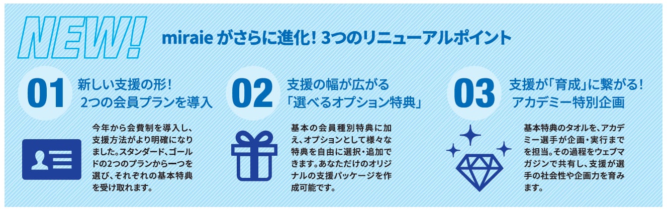 【会員有効期限】 ・2027年6月末日まで(いつご入会いただいても期限は同じです) 【特典内容】 ・新規会員カード(継続の方には継続特典をご用意しています) ・支援者名掲載(月刊誌Winning goal、WEBマガジンRise up!、ゴール裏ピッチ看板、miraie公式HP、スタジアムビジョン) ・アカデミープロジェクトタオル(素材:綿100% サイズ:約1100×400mm) ・miraie推し活バッグ(素材:ポリエステル+PVC サイズ:約460×310×100mm) ・新規紹介キャンペーン(1月中旬以降希望選手を確認させていただき、ご用意が出来次第お届け) ・オプション特典受付権利 ・イベント参加権利(会員カードが必要です) ※会員カードを紛失された場合、再発行はできません。新規でのお取り扱いとなり、継続特典は付きませんのでご了承ください。 ※2027/28シーズンは有効期間1年間で¥15,000 【発送目安】受付後約7営業日以内に発送予定。同時に複数ご支援いただいた場合、一番遅い納期の商品とまとめて発送となります。 継続特典や紹介キャンペーンをご利用時は1月末準備が整い次第の発送となります。 ※ご注文後のキャンセルや変更はお受けできません。ご注文内容をよくご確認の上、ご注文をお願いいたします。