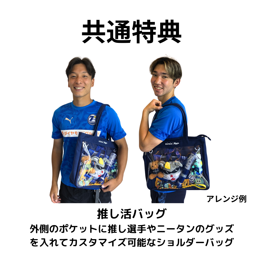バッグの前面の透明ポケットに見せたいアイテムを自分好みにアレンジできるトートバッグです。推し選手やニータンの写真や缶バッジ、ストラップ、ぬいぐるみ、アクリルスタンドなどを入れてお気に入りのオリジナルトートバッグを作成できます!
