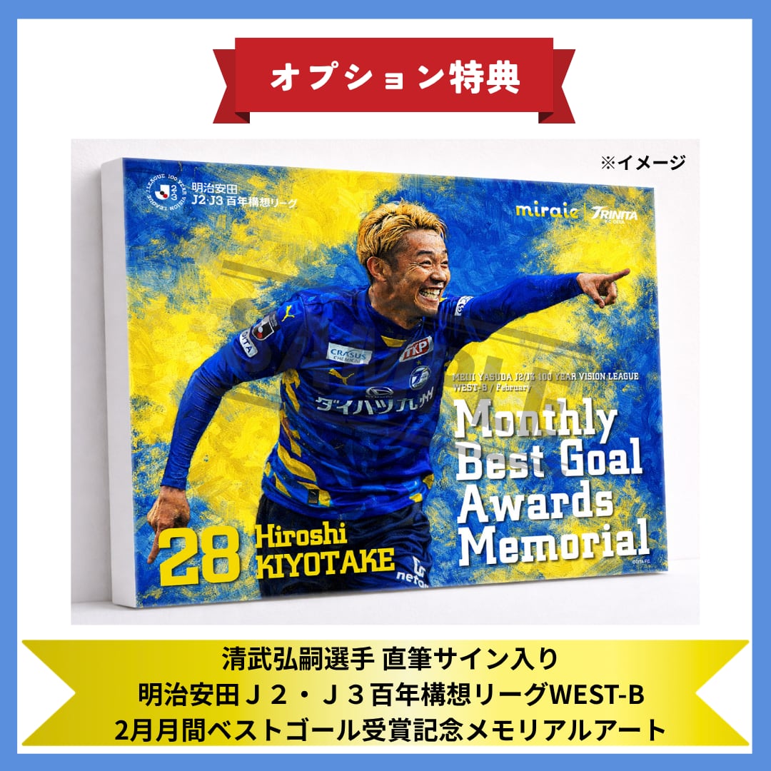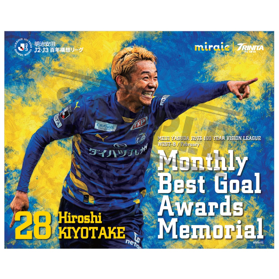 大分トリニータアカデミーOBの清武弘嗣選手の大分トリニータ復帰後初ゴール(2/22(日)ガイナーレ鳥取戦)が見事、明治安田J2・J3百年構想リーグ WEST-B の2月月間ベストゴール賞を受賞されましたことを記念し、新特典としてメモリアルアートの受注を受付させていただきます。